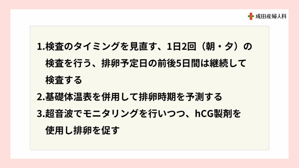 排卵検査薬でLHサージが検出されない場合、次のような対処が考えられます。