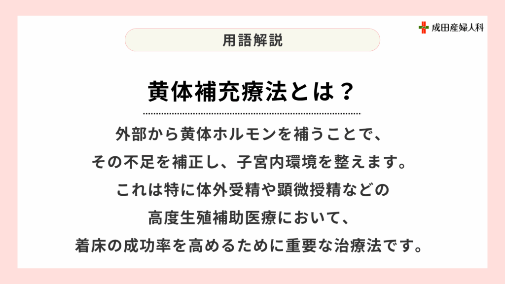 黄体補充療法では、外部から黄体ホルモンを補うことで、その不足を補正し、子宮内環境を整えます。これは特に体外受精(IVF)や顕微授精(ICSI)などの高度生殖補助医療において、着床の成功率を高めるために重要な治療法です。