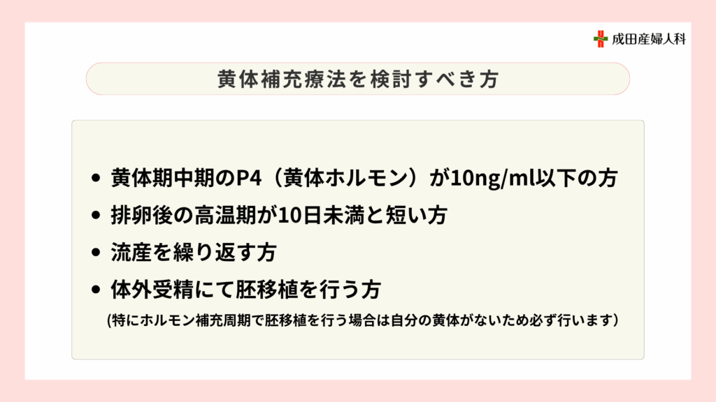 同じ人でも周期により変動があるため、諸説ありますが、目安として上記のような場合に黄体補充が必要になると考えられます。