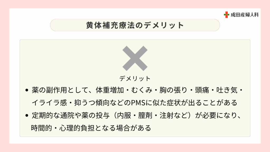 黄体ホルモン補充療法には、妊娠に向けてポジティブな影響をもたらす可能性が高い一方で、上記のようなデメリットが存在します。