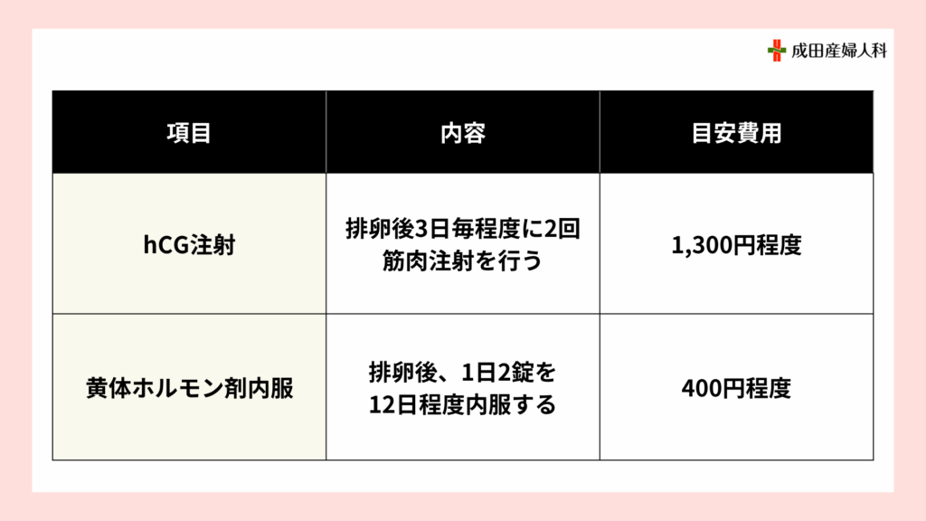 1)黄体ホルモン値の低値や高温期短縮の方は、 排卵前後にhCG製剤の注射(黄体賦活法)を使用したり、排卵後に内服薬による黄体ホルモンの補充を行います。